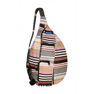 This mini sling cotton canvas pack features adjustable rope shoulder strap with side release buckle, two vertical zip compartments, two key or cell phone pockets, padded back with KAVU embroidery.