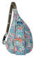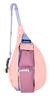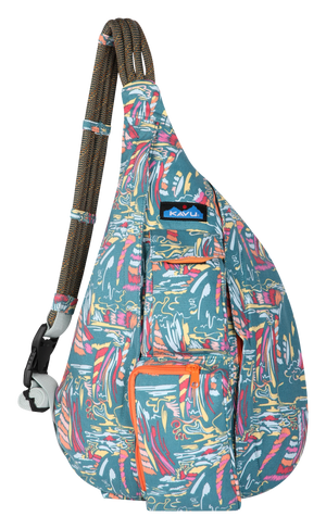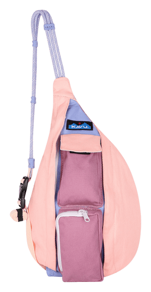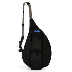 This mini sling cotton canvas pack features adjustable rope shoulder strap with side release buckle, two vertical zip compartments, two key or cell phone pockets, padded back with KAVU embroidery.